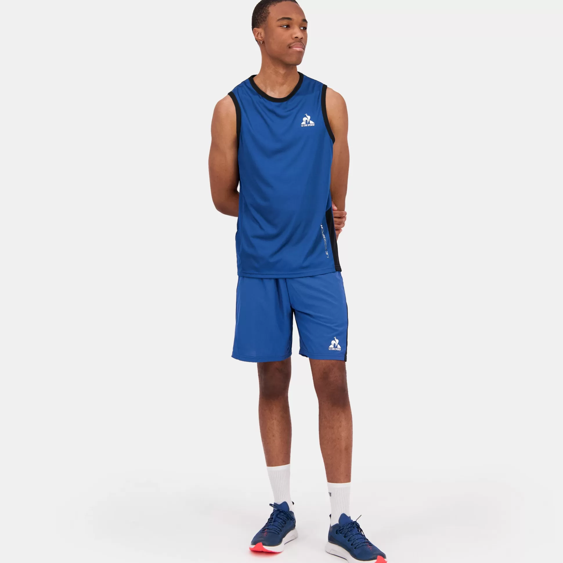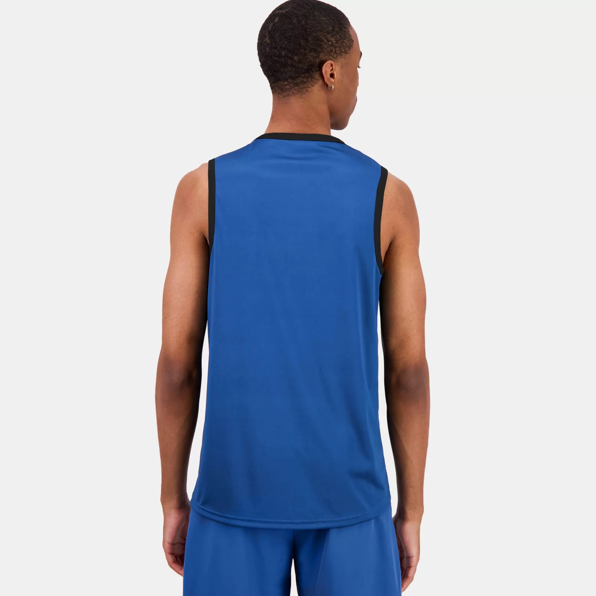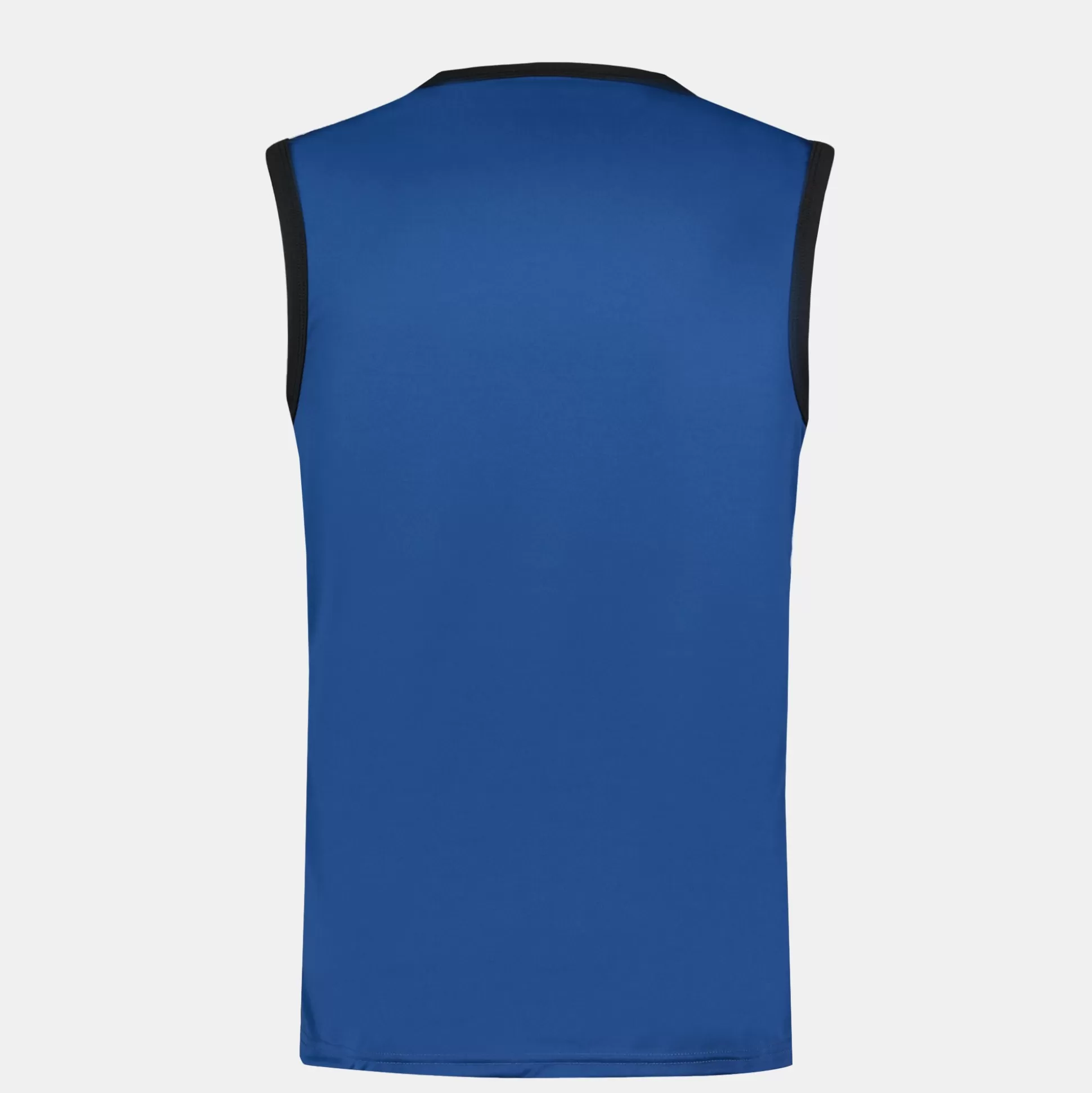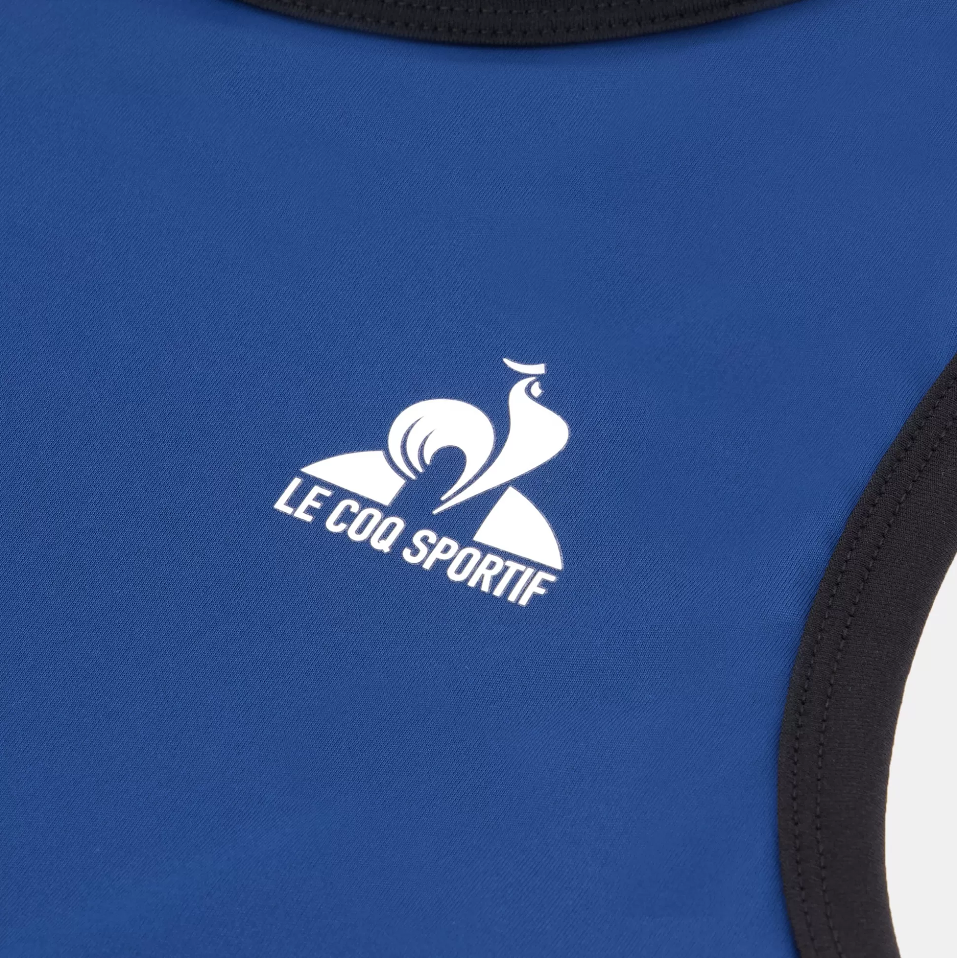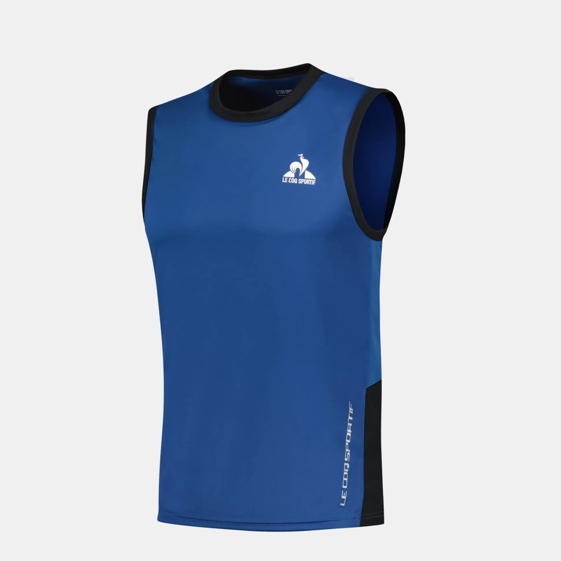 CARACTÉRISTIQUES TECHNIQUES : – Débardeur bleu d’entrainement homme – Interlock 100%Polyester – Confortable, extensible et doux au porté – Coupe slim / près du corps – Empiècement contrasté sur côté gauche au porté en Jersey double fonture 100% Polyester – Côte 1×1 à encolure et aux emmanchures – Transfert « Logo du Coq » sur la poitrine côté gauche au porté et transfert écriture »LE COQ SPORTIF » bas de corps sur côté gauche au porté