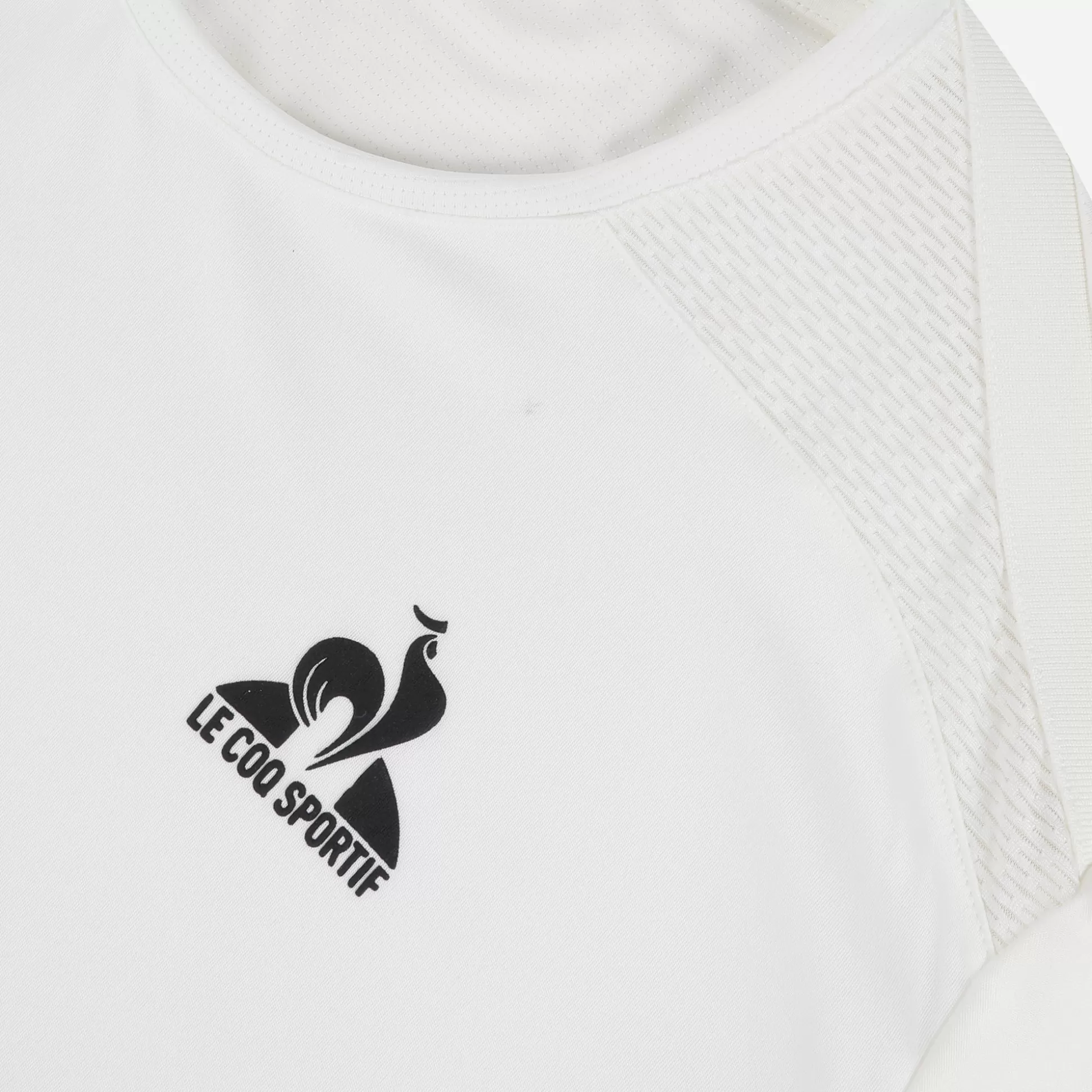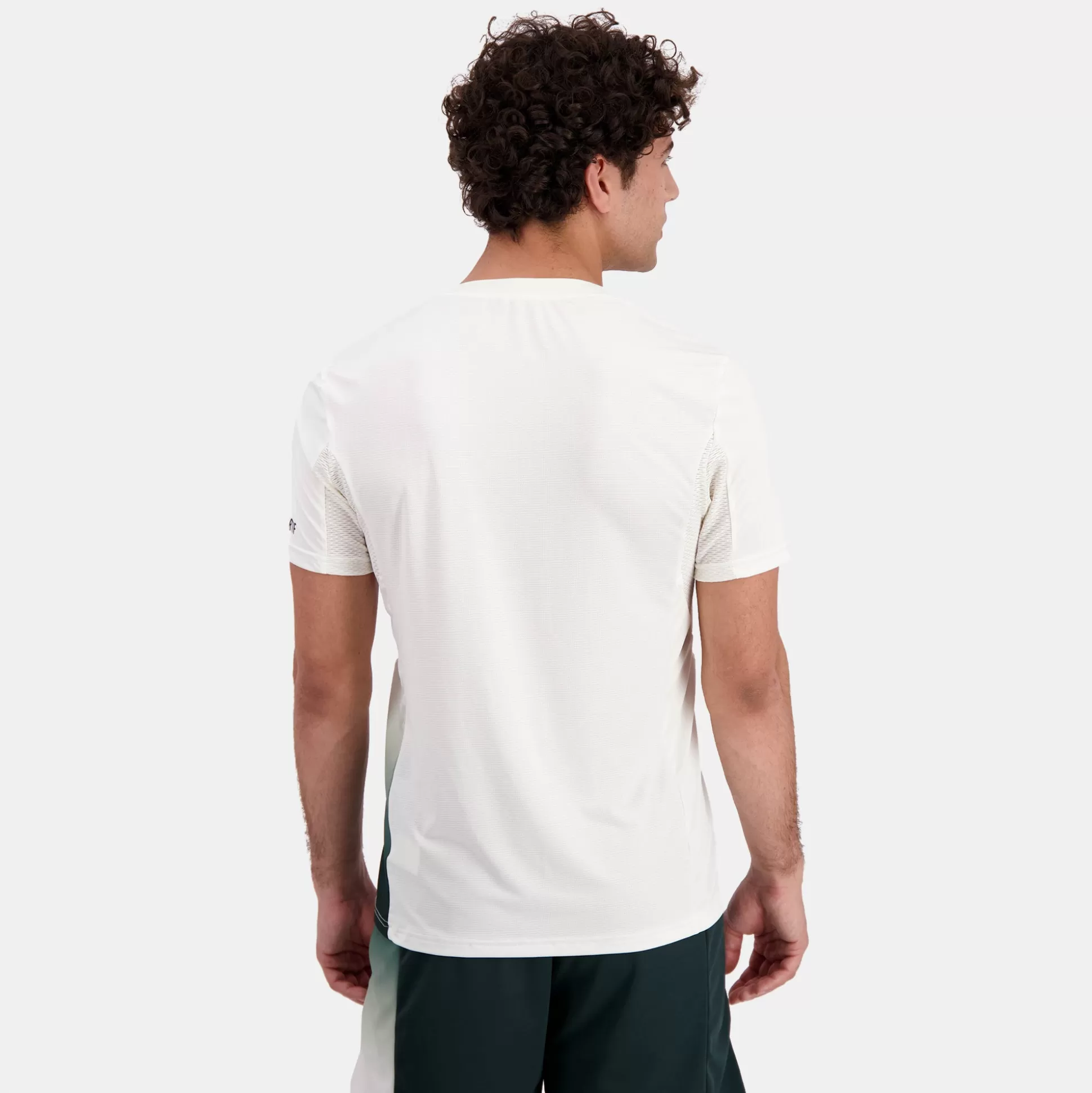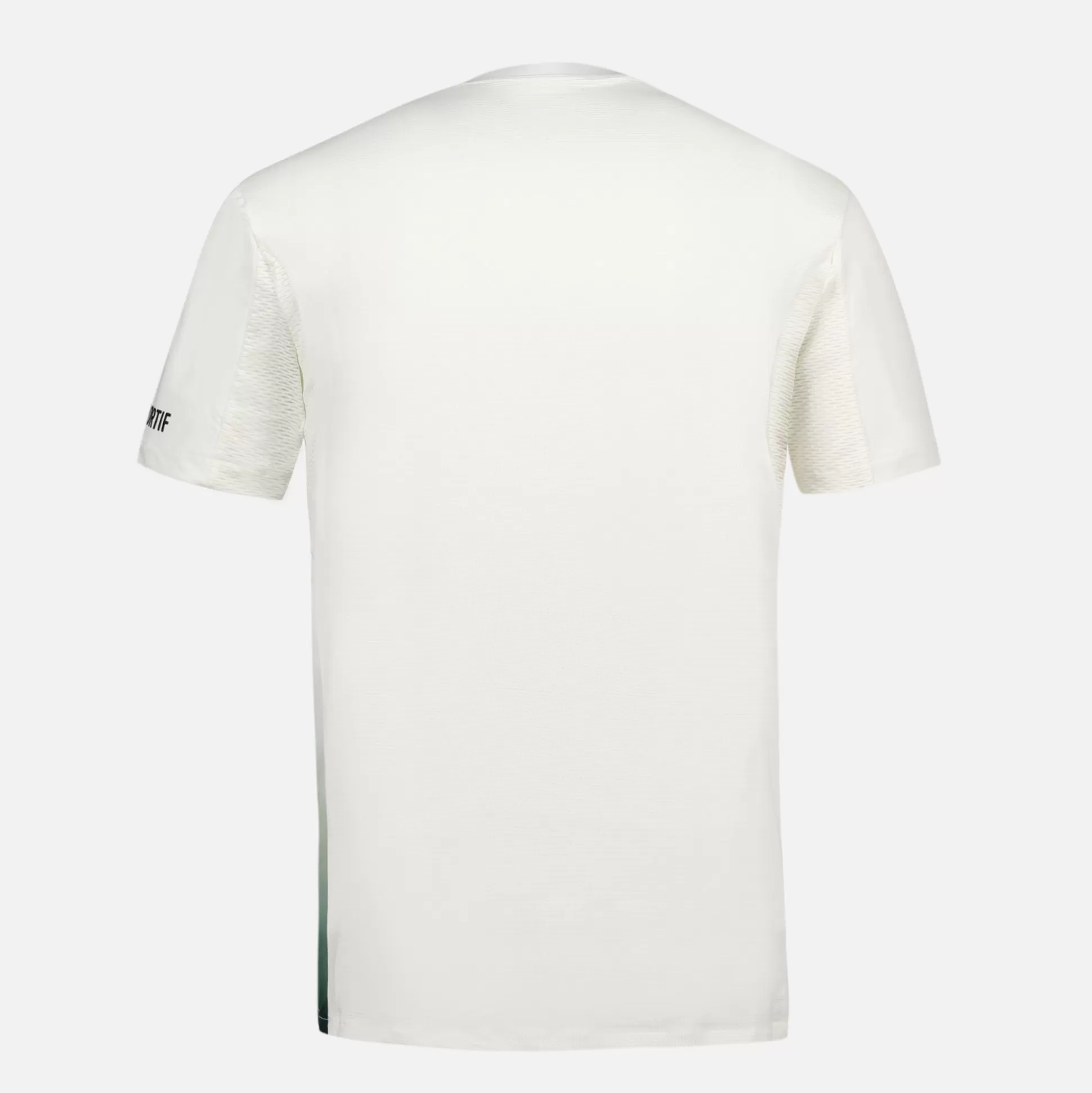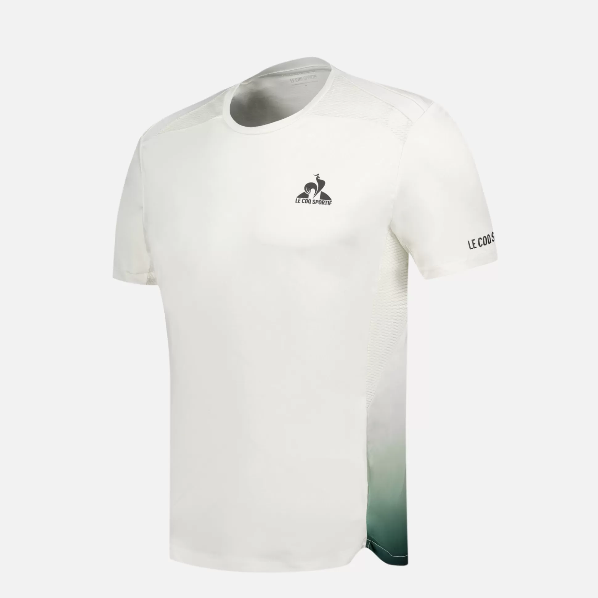 Soyez élégant et performant avec ce t-shirt porté sur la deuxième partie de la saison professionnelle notamment lors du grand chelem américain. Une bande rectiligne respirante renforce cette élegance au niveau du col. Le jeu de lumière est joué en dégradé sur le côté gauche. Ce t-shirt arbore des découpes fonctionnelles et des matières ajourées dans des zones clés qui permettent de gagner en fluidité sur chaque frappe tout en ayant un séchage rapide. Son nouveau trio de matières légères et respirantes en polyester vous gardera au sec tout au long du match. Sur le devant, retrouvez une matière en polyester recyclée. Ce t-shirt est porté par nos joueurs professionnels.Caractéristiques techniques CARACTERISTIQUES TECHNIQUES : – Logo « Le Coq Sportif » monochrome en technique print HD poitrine gauche au porté – Ecriture « Le Coq Sportif » monochrome en technique print HD manche gauche au porté – Matière devant en polyester recyclée : 100% polyester – Matière dos ultra légère et élastique avec séchage rapide : 93% polyester / 7% elasthanne – Matière empiècement épaules et côté gauche en dégradé : 95% polyester / 5% elasthanne – Col léger en polyester – Découpes athlétiques épaules et sous le bras gauche avec effet dégradé de couleurs – Produit tricoté et teint en Espagne, et fabriqué au Maroc
