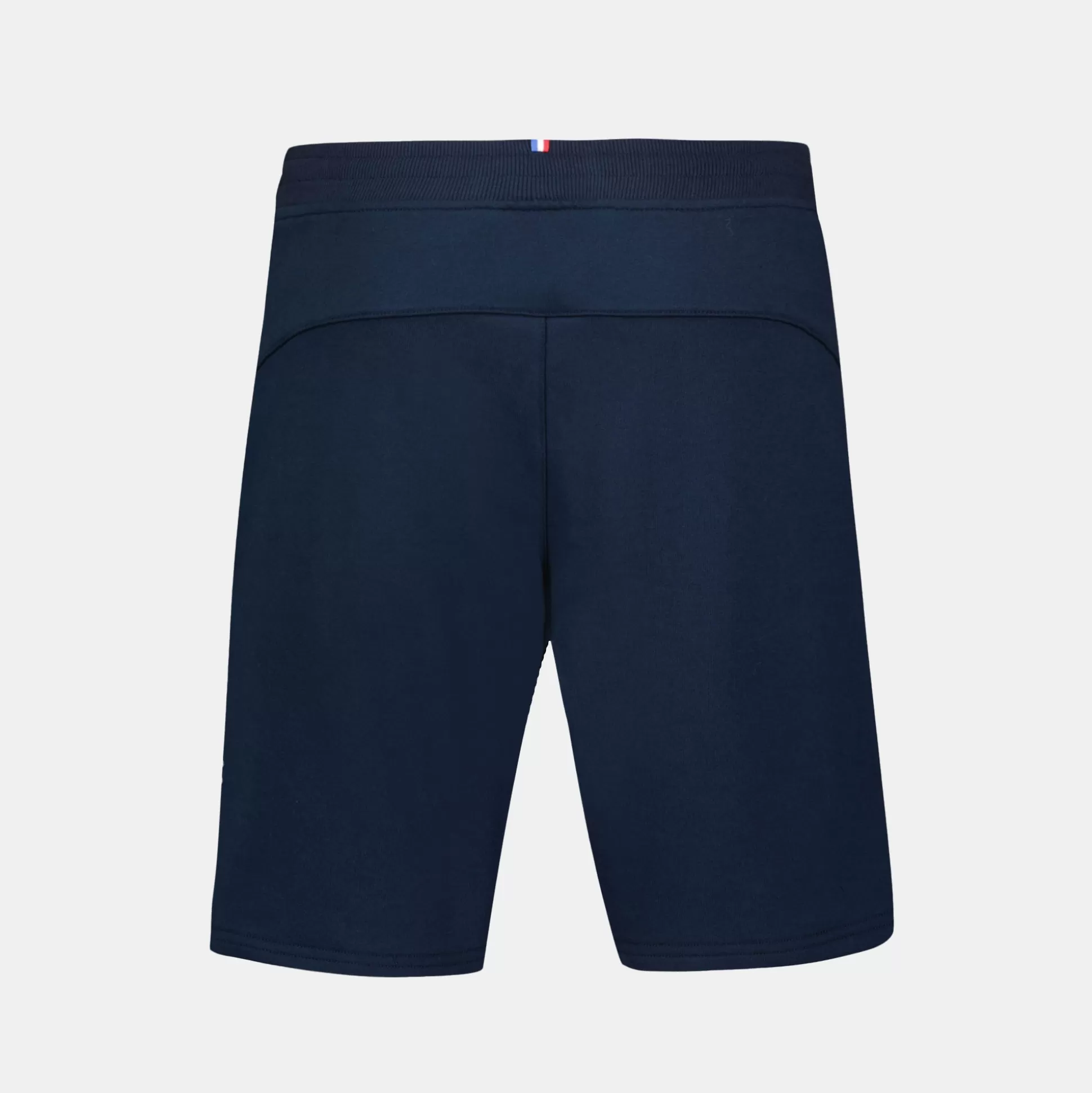 CARACTÉRISTIQUES TECHNIQUES : – Short bleu marine – Molleton 60%Coton 40%Polyester – Bonne tenue, agréable et doux au porté – Coupe regular / classique – Ceinture en côte 2×2 élastiquée avec cordon de serrage intérieur , 2 poches zippées coutures côtés, fausse braguette – Badge brodé « Logo du Coq Ton/Ton » appliqué sur la jambe côté gauche au porté